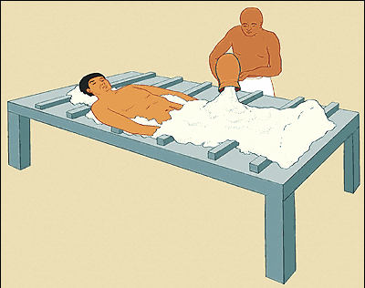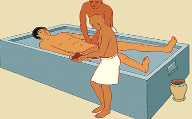 (Natron; sodyum karbonat, sodyum bikarbonat ve sodyum kloridle, sodyum sülfatın karışımından oluşan bir maddedir.) Daha sonra bu madde vücuttan çıkarılır, kol ve bacaklar gibi vücudun eklemli yerleri çamur ya da kumla sarılır, sonra beden reçineye batırılmış ketenle, kokulu bir çeşit sarı sakızla ve tarçınla sarılırdı.