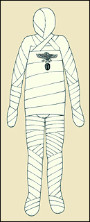 Daha sonra şeritler kullanılarak özenle sarılan mumya, koruyucu muskalarla kaplanırdı. Ölü yıkandıktan sonra burnundan sokulan aletlerle beyin boşaltılırdı. Göz ve ağız boşukları, yağlı keten tamponlarla doldurulup göz kapakları kapatılırdı.